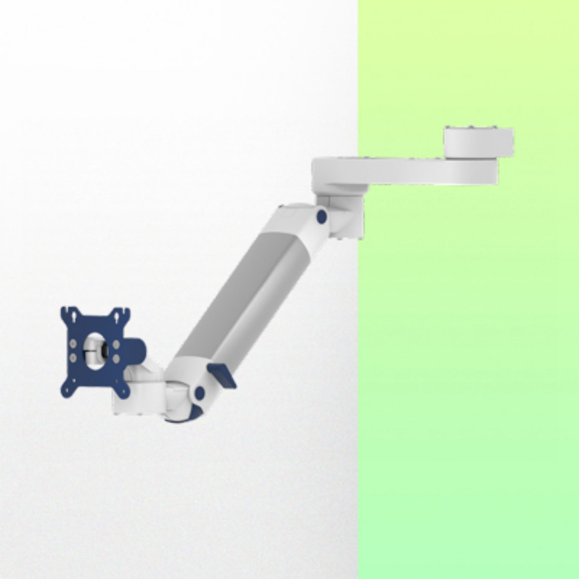 Extended Height Adjustable Arm, wall-mounted on a vertical sliding rail. Supported weight balancing range from 4 to 9 Kg. Overhead mount