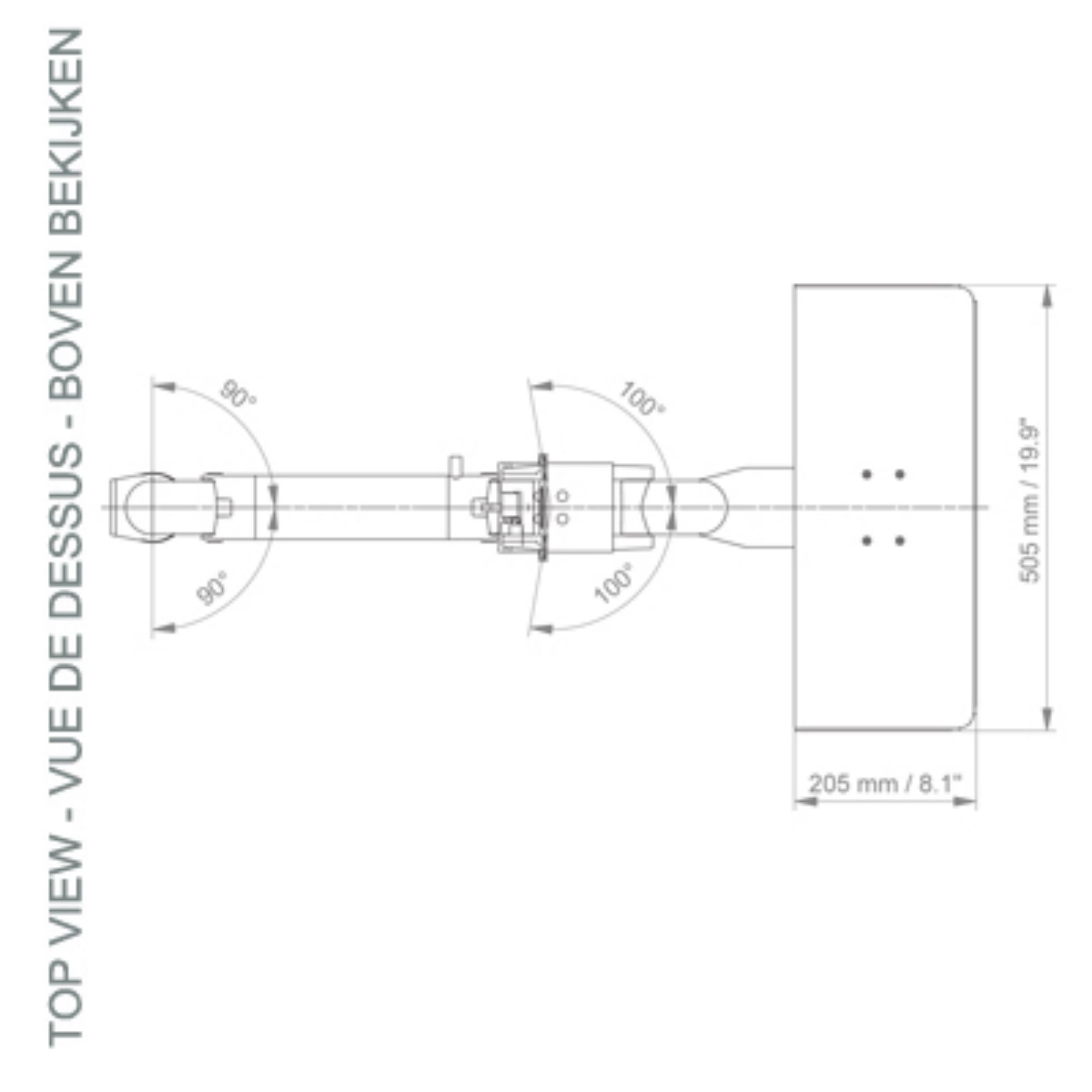 * Rotation du bras: 90° à droite, 90° à gauche à partir du point de fixation.